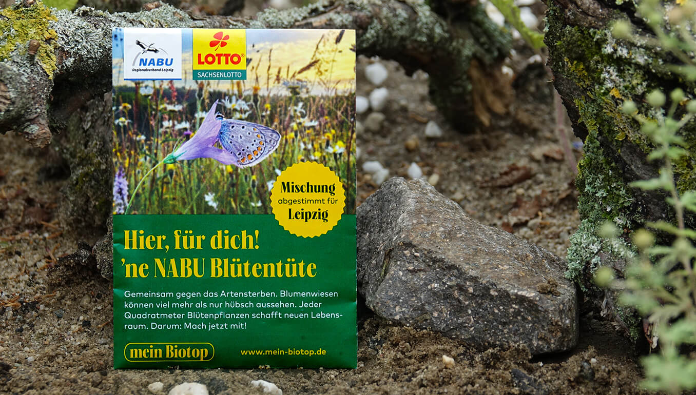 Unsere NABU Blütentüte bietet Saatgut speziell für Leipzig mit Nektar- und Pollenquellen für Wildbienen sowie Raupenfuttergräser für Schmetterlinge. Enthält 37 Blütenpflanzen und 10 Raupenfuttergräser.